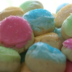 - To make the icing, cream together the confectioners’ sugar, 1/2 cup butter, and 1 teaspoon vanilla and 1 teaspoon almond extracts. Beat in 3 tablespoons milk, one tablespoon at a time, then stir in the food coloring if desired. After cookies have cooled completely, dip them into the icing and allow to dry.