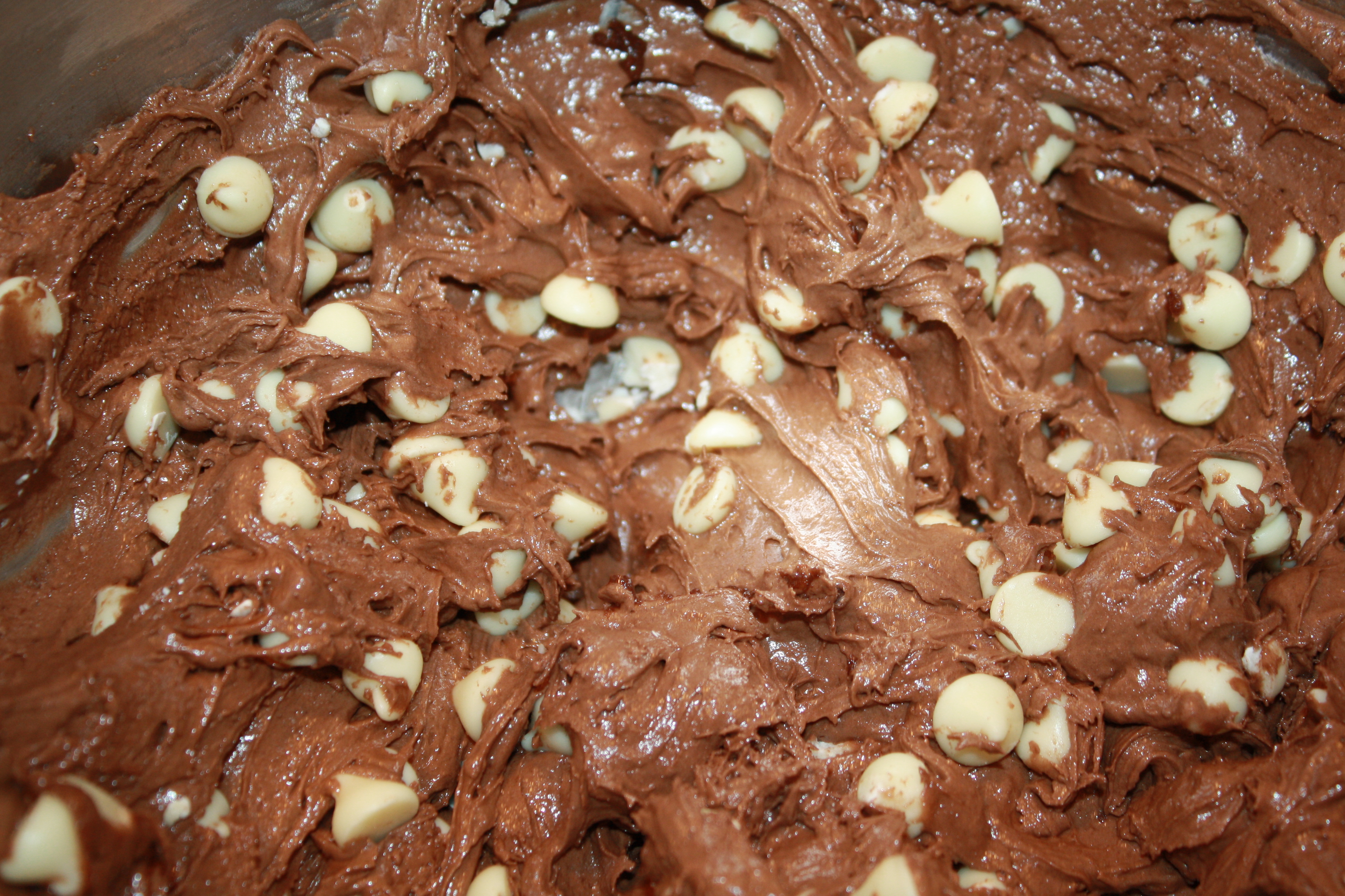 and then I mixed them like I was making a cake. After they were all incorporated, I added the white chocolate chips. I didn’t measure though. A half cup seemed kind of skimpy, so I used half of the bag.
