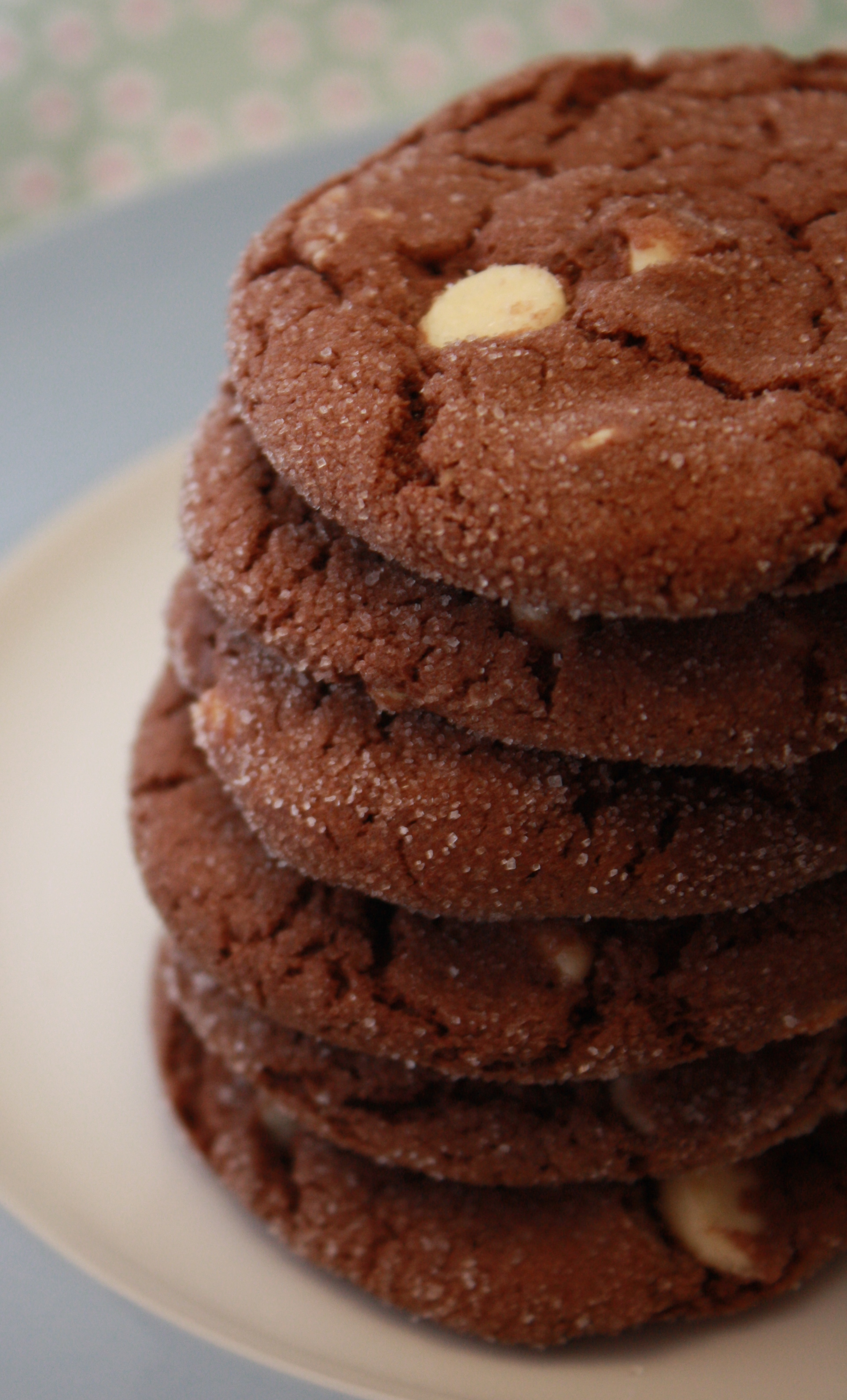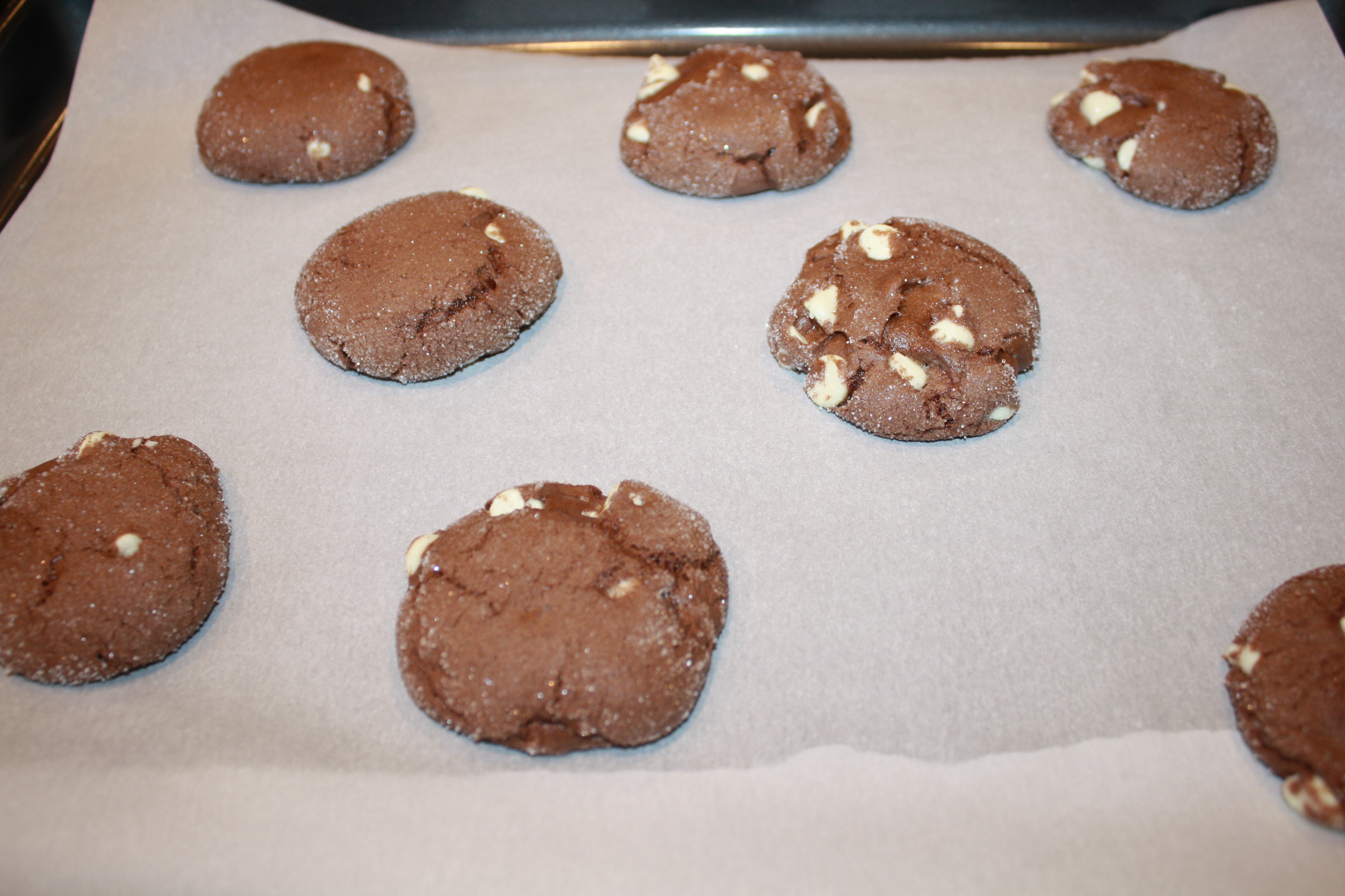 I had some white chocolate chips sitting in the pantry, so I went looking on the boards for something to do with them. I had this idea about a chocolate cookie, with the white chocolate chips, so when I came across a recipe for using devil’s food cake mix in the batter, I had to try it. The photo on Pinterest looks like this: