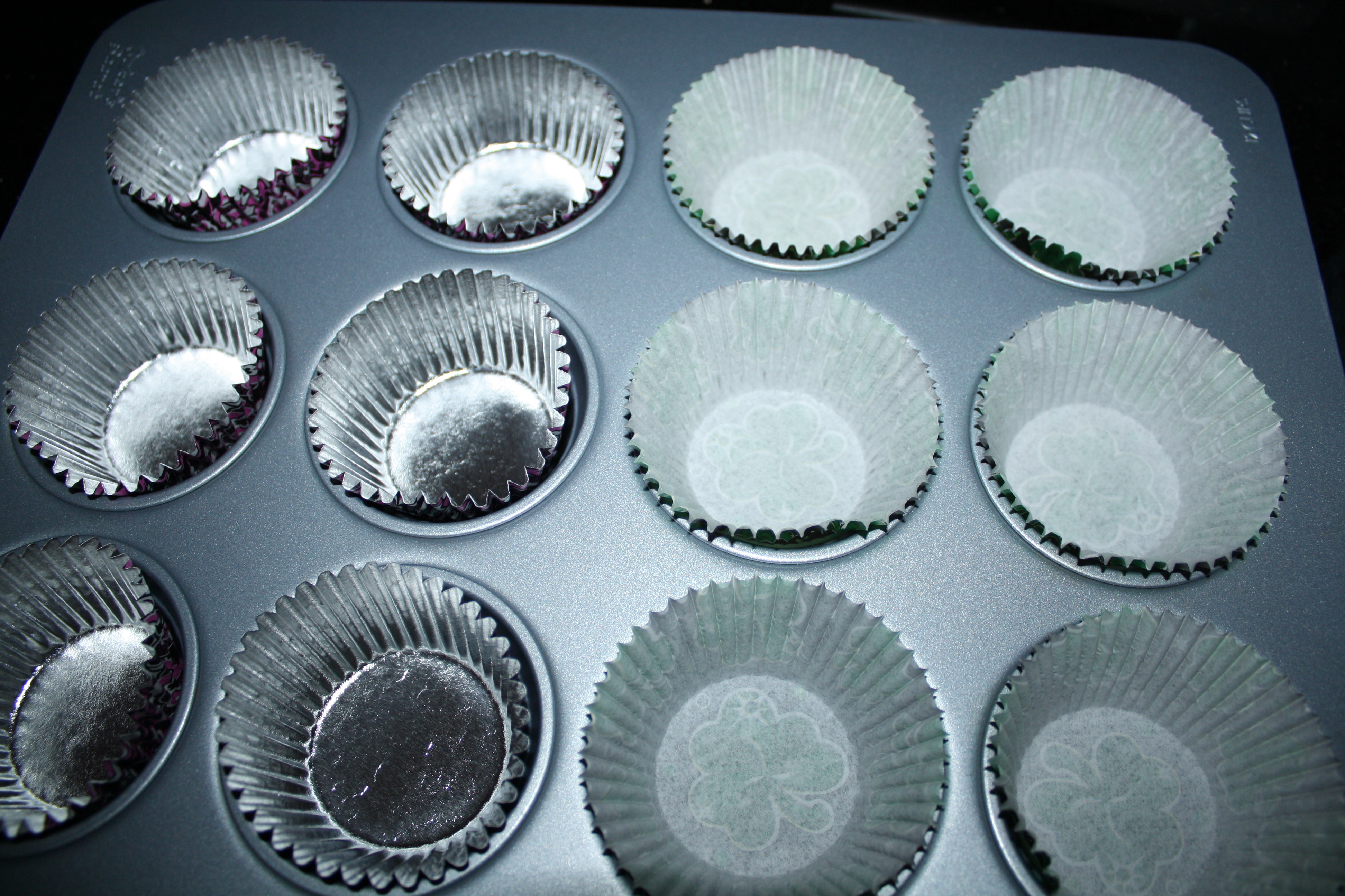 I don’t have one of those square muffin pans, because every time I look at one in the store, I figure I won’t get enough use out of it, so I went with my regular round muffin tin, and in the interest of a quick clean-up, I lined each cup with a muffin liner. Also, because I wasn’t sure what effect the liner would have on the baking time versus just a straight metal pan, I did half with aluminum-lined liners. I really like these liners, by the way. They bake up really nicely, and there’s no “bleed through” like you might get with a regular paper liner. In the end though, baking time did not differ between the two.