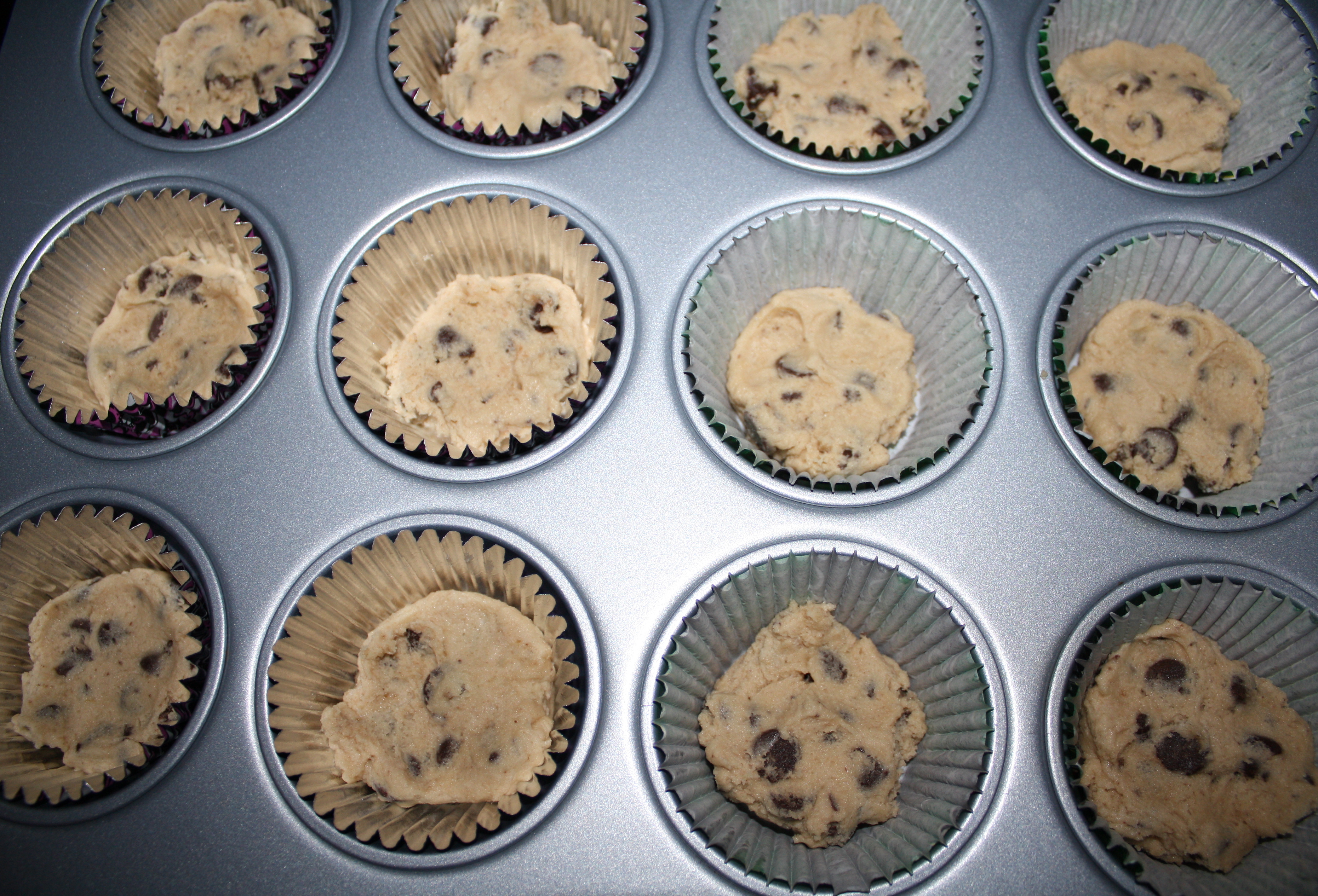 - Smoosh 1.5 squares of break-apart refrigerated cookie dough into the bottom of each well.