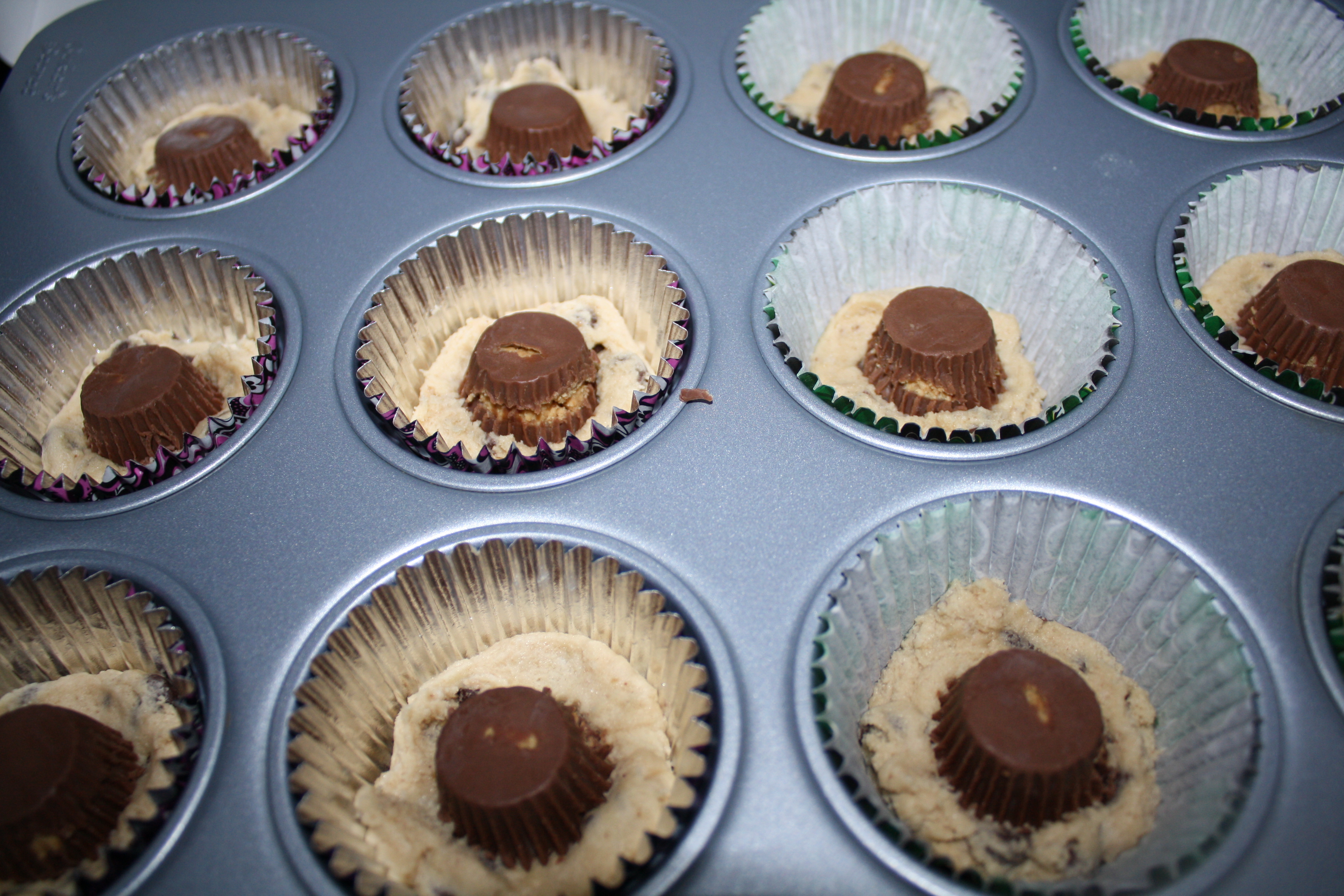 Next, I put miniature Reese’s Peanut Butter Cups on top of the dough,