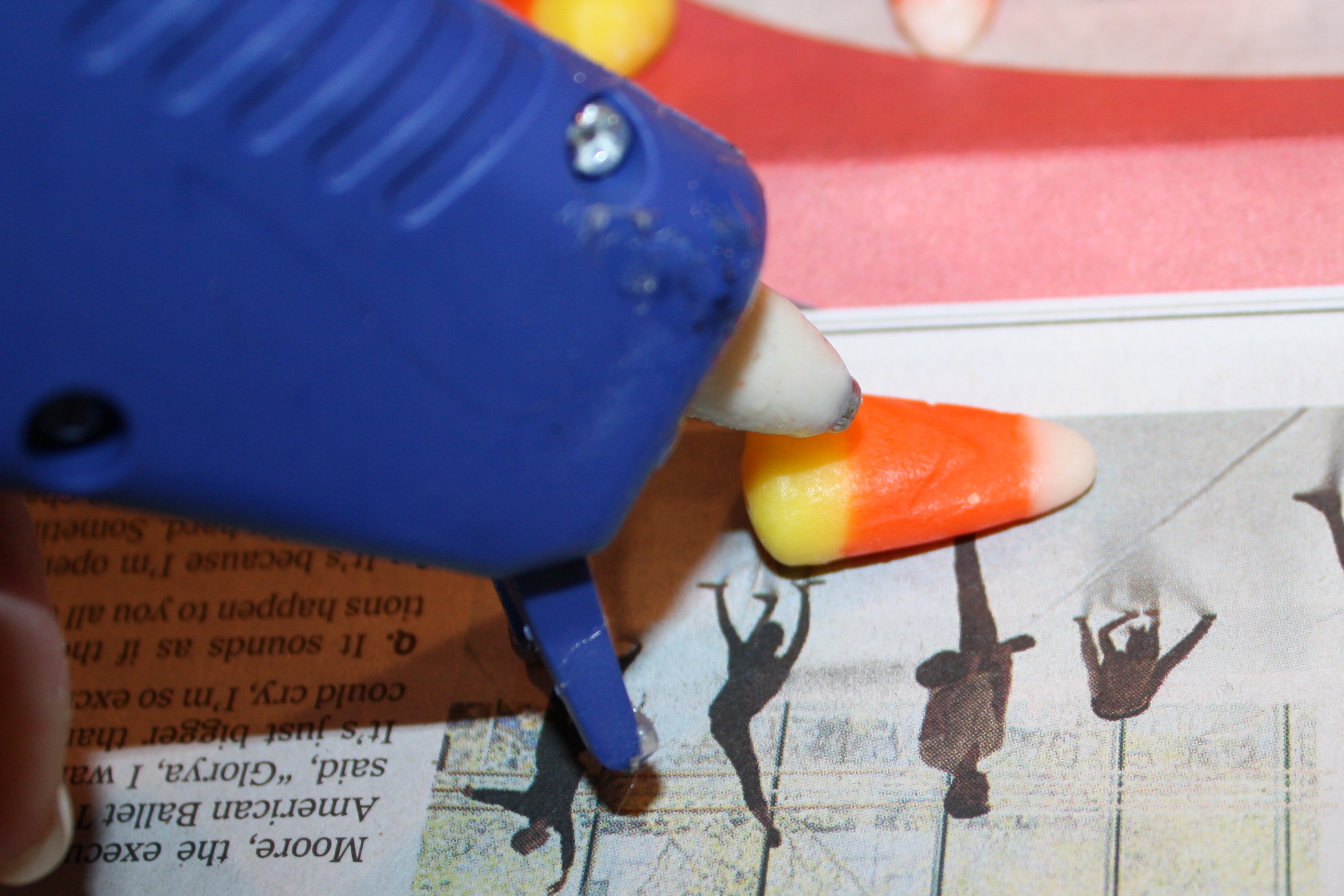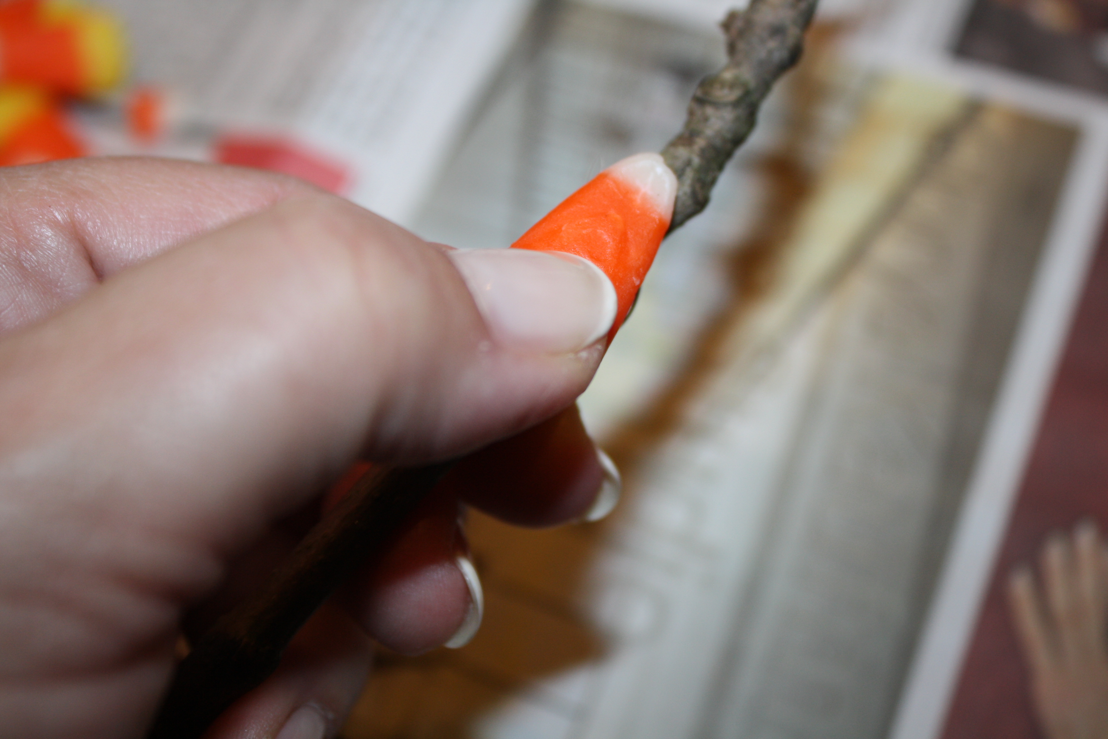The candy corn was hot-glued to the sticks,