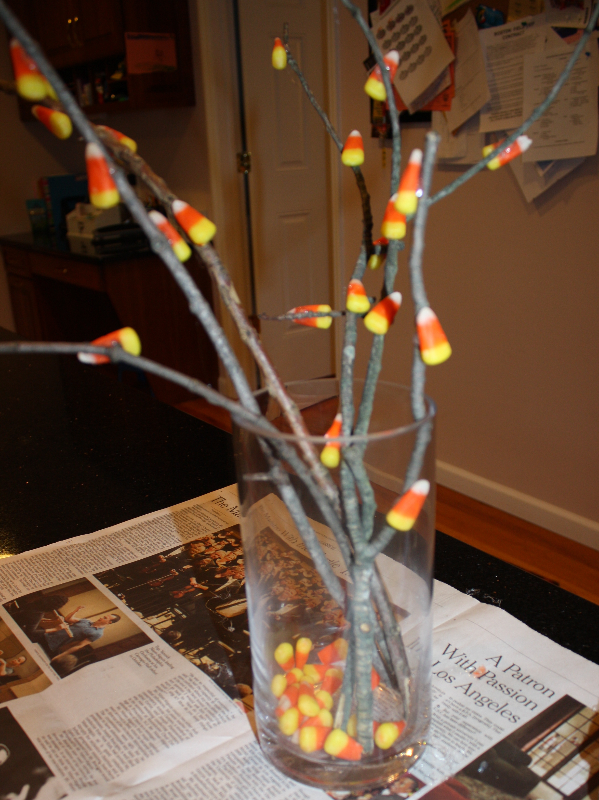 First I assembled the pieces. I found the sticks on the ground in my neighborhood. The vase was old, and the candy corn cost about a dollar.