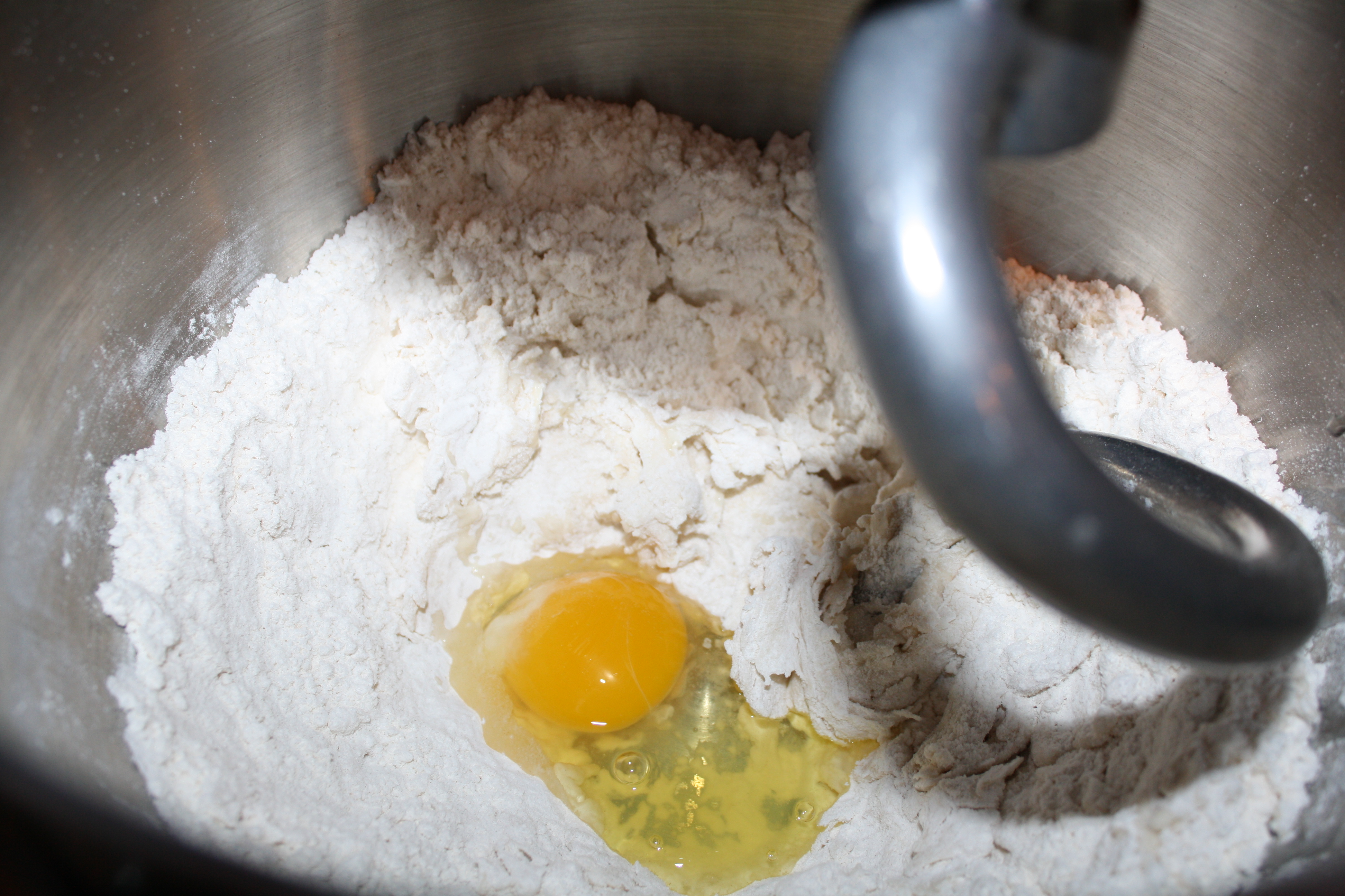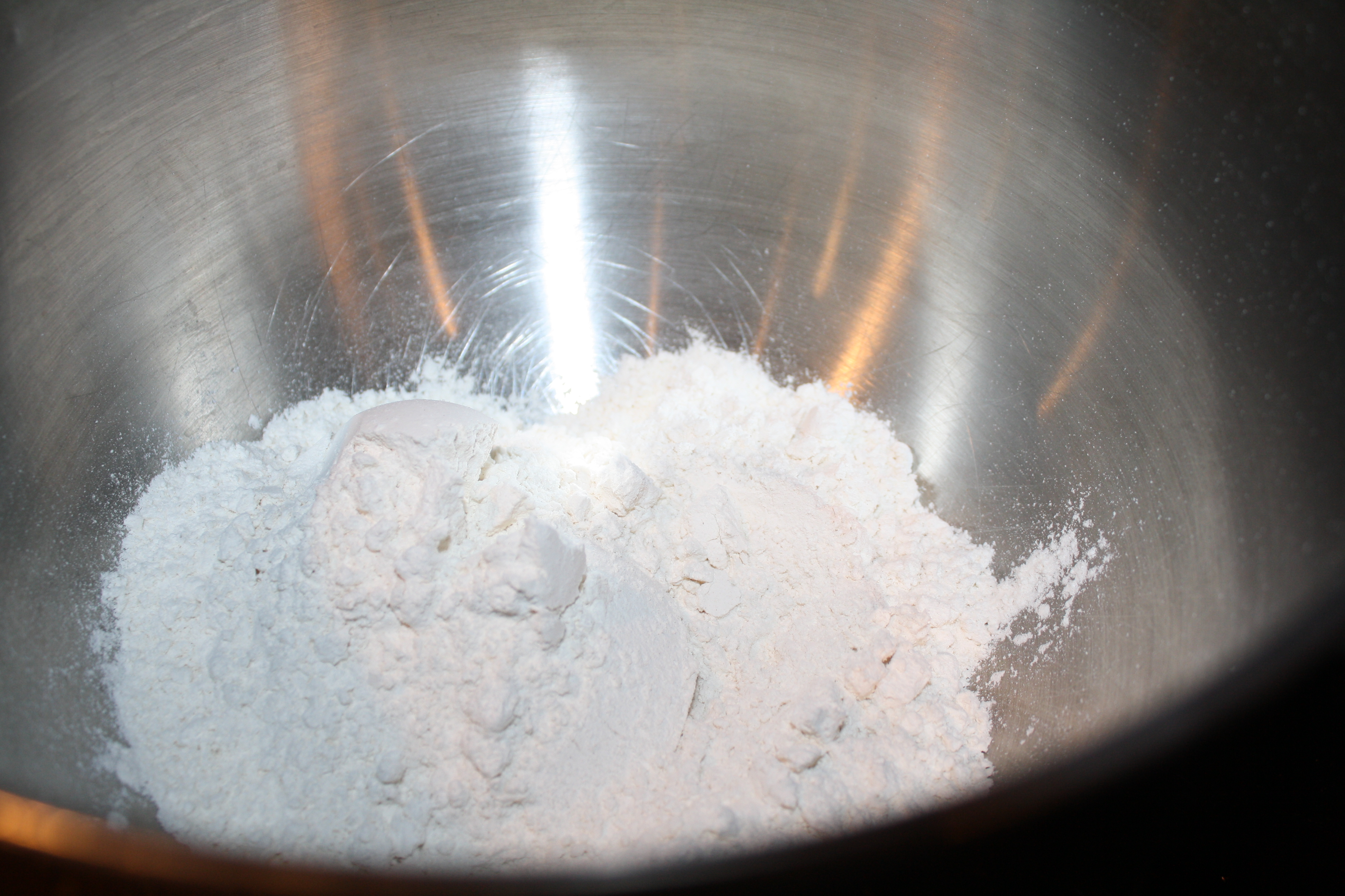 Preheat the oven to 400 degrees, and begin with the flour in the mixing bowl.